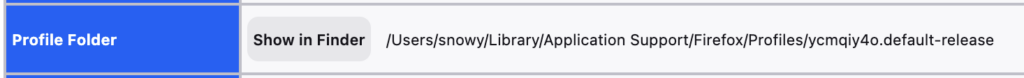 Again in the Firefox address bar, type about:support. Now scroll down to the table until a row that says “Profile Folder“, and click on “Show in Finder”.