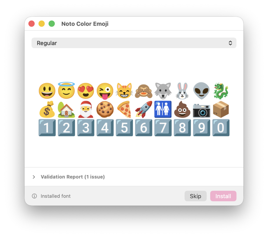 Simply search for the emoji style that you want and download the emoji font file. It’s file extension should end with .ttf or .otf. Then, open Finder and double click on the font file. It should open a Font Book installer where you can press Install.